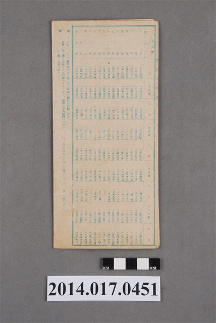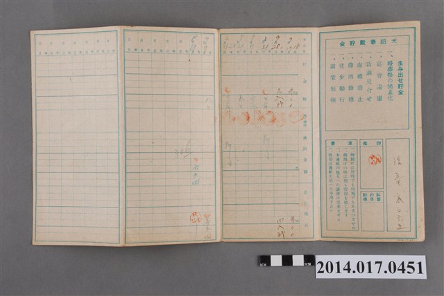 地址登載為後龍底265。本物件為戰爭期間1943年~1945年期間後龍、公司寮、水尾子、二張犁、大山腳、頭湖、崎頂等地人民之銷帳儲金簿,內頁印有大詔奉戴字樣,並以婚葬儀式簡化、宴會遠慮、新謁見合せ、虛禮廢止、節酒節煙、徒步勵行、副業勉強倡導儲金,另外印有儲簿規定如:不許轉讓、改印需申請等,背頁附有複利合計表。大詔指的是1941年對美、英兩國之宣戰詔書,1942年起每個月8日定為大詔奉戴日,為日本政府為太平洋戰爭所運作的國民運動,隨著戰爭規模擴大,戰時有各項國民強迫儲蓄的舉措,以支援前線戰事,1938年日本政府為因應中日戰爭即推行有愛國儲蓄運動,本物件則為1942年後因應戰爭規模擴大後之儲蓄項目,范雅鈞指出本儲金簿為強制存款,直接由薪資扣除。