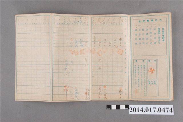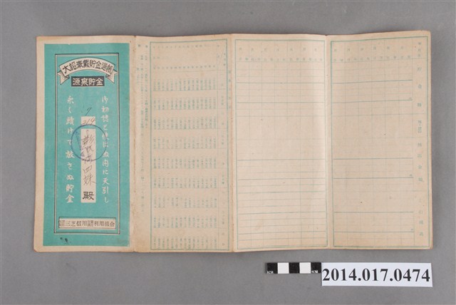本物件為戰爭期間1943年~1945年期間後龍、公司寮、水尾子、二張犁、大山腳、頭湖、崎頂等地人民之銷帳儲金簿,內頁印有大詔奉戴字樣,並以婚葬儀式簡化、宴會遠慮、新謁見合せ、虛禮廢止、節酒節煙、徒步勵行、副業勉強倡導儲金,另外印有儲簿規定如:不許轉讓、改印需申請等,背頁附有複利合計表。大詔指的是1941年對美、英兩國之宣戰詔書,1942年起每個月8日定為大詔奉戴日,為日本政府為太平洋戰爭所運作的國民運動,隨著戰爭規模擴大,戰時有各項國民強迫儲蓄的舉措,以支援前線戰事,1938年日本政府為因應中日戰爭即推行有愛國儲蓄運動,本物件則為1942年後因應戰爭規模擴大後之儲蓄項目,范雅鈞指出本儲金簿為強制存款,直接由薪資扣除。