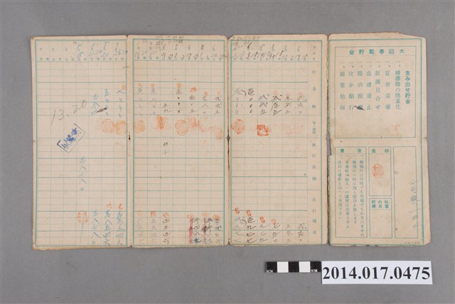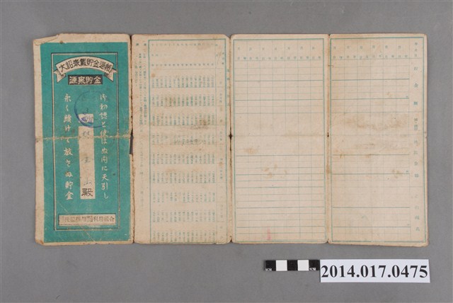 地址載有公司寮132。本物件為戰爭期間1943年~1945年期間後龍、公司寮、水尾子、二張犁、大山腳、頭湖、崎頂等地人民之銷帳儲金簿,內頁印有大詔奉戴字樣,並以婚葬儀式簡化、宴會遠慮、新謁見合せ、虛禮廢止、節酒節煙、徒步勵行、副業勉強倡導儲金,另外印有儲簿規定如:不許轉讓、改印需申請等,背頁附有複利合計表。大詔指的是1941年對美、英兩國之宣戰詔書,1942年起每個月8日定為大詔奉戴日,為日本政府為太平洋戰爭所運作的國民運動,隨著戰爭規模擴大,戰時有各項國民強迫儲蓄的舉措,以支援前線戰事,1938年日本政府為因應中日戰爭即推行有愛國儲蓄運動,本物件則為1942年後因應戰爭規模擴大後之儲蓄項目,范雅鈞指出本儲金簿為強制存款,直接由薪資扣除。