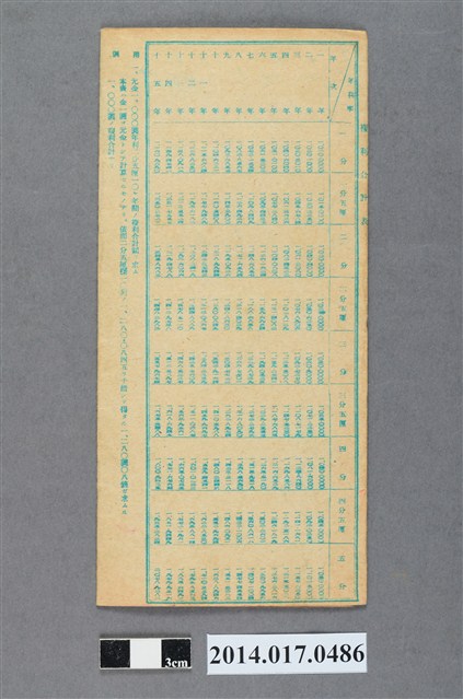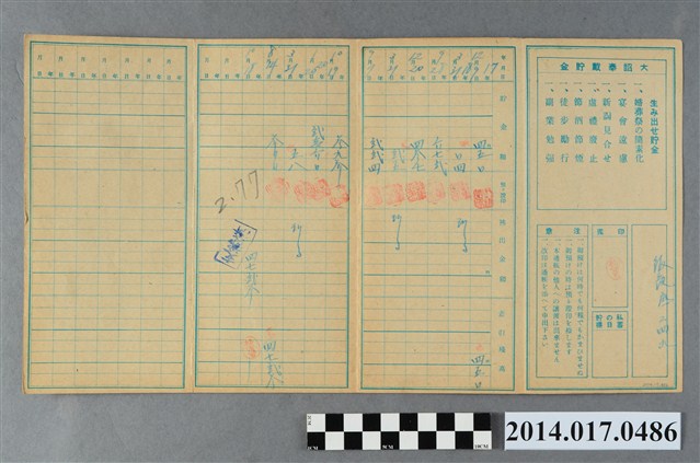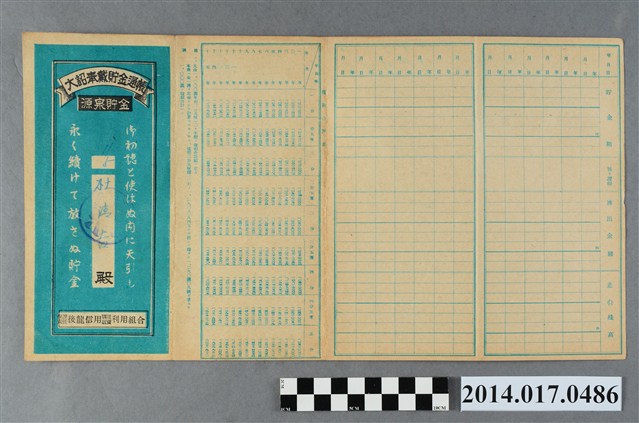 地址登載為後龍底249。本物件為戰爭期間1943年~1945年期間後龍、公司寮、水尾子、二張犁、大山腳、頭湖、崎頂等地人民之銷帳儲金簿,內頁印有大詔奉戴字樣,並以婚葬儀式簡化、宴會遠慮、新謁見合せ、虛禮廢止、節酒節煙、徒步勵行、副業勉強倡導儲金,另外印有儲簿規定如:不許轉讓、改印需申請等,背頁附有複利合計表。大詔指的是1941年對美、英兩國之宣戰詔書,1942年起每個月8日定為大詔奉戴日,為日本政府為太平洋戰爭所運作的國民運動,隨著戰爭規模擴大,戰時有各項國民強迫儲蓄的舉措,以支援前線戰事,1938年日本政府為因應中日戰爭即推行有愛國儲蓄運動,本物件則為1942年後因應戰爭規模擴大後之儲蓄項目,范雅鈞指出本儲金簿為強制存款,直接由薪資扣除。