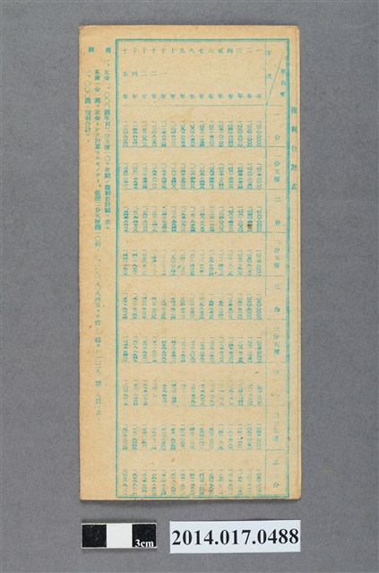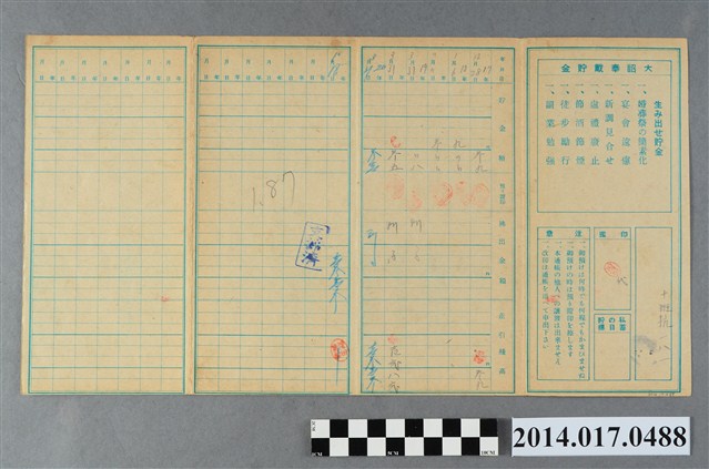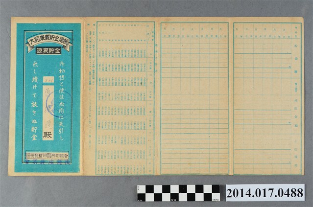 地址登載為十班坑181。本物件為戰爭期間1943年~1945年期間後龍、公司寮、水尾子、二張犁、大山腳、頭湖、崎頂等地人民之銷帳儲金簿,內頁印有大詔奉戴字樣,並以婚葬儀式簡化、宴會遠慮、新謁見合せ、虛禮廢止、節酒節煙、徒步勵行、副業勉強倡導儲金,另外印有儲簿規定如:不許轉讓、改印需申請等,背頁附有複利合計表。大詔指的是1941年對美、英兩國之宣戰詔書,1942年起每個月8日定為大詔奉戴日,為日本政府為太平洋戰爭所運作的國民運動,隨著戰爭規模擴大,戰時有各項國民強迫儲蓄的舉措,以支援前線戰事,1938年日本政府為因應中日戰爭即推行有愛國儲蓄運動,本物件則為1942年後因應戰爭規模擴大後之儲蓄項目,范雅鈞指出本儲金簿為強制存款,直接由薪資扣除。