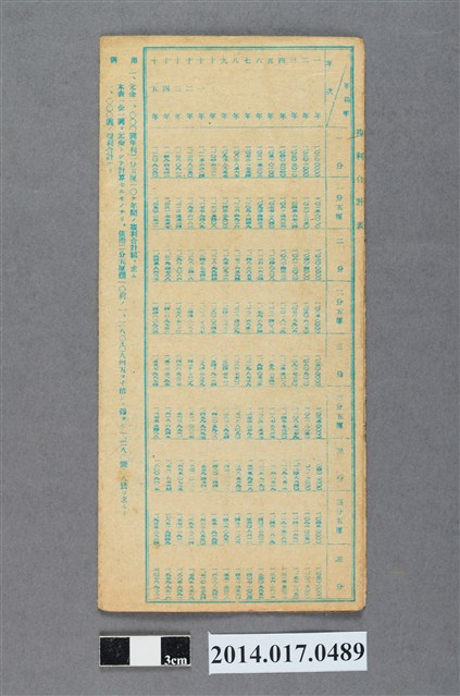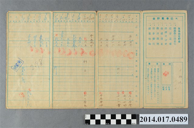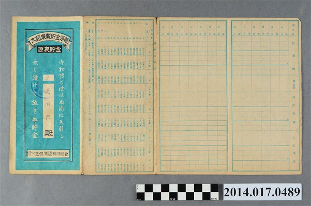 地址登載為十班坑217。本物件為戰爭期間1943年~1945年期間後龍、公司寮、水尾子、二張犁、大山腳、頭湖、崎頂等地人民之銷帳儲金簿,內頁印有大詔奉戴字樣,並以婚葬儀式簡化、宴會遠慮、新謁見合せ、虛禮廢止、節酒節煙、徒步勵行、副業勉強倡導儲金,另外印有儲簿規定如:不許轉讓、改印需申請等,背頁附有複利合計表。大詔指的是1941年對美、英兩國之宣戰詔書,1942年起每個月8日定為大詔奉戴日,為日本政府為太平洋戰爭所運作的國民運動,隨著戰爭規模擴大,戰時有各項國民強迫儲蓄的舉措,以支援前線戰事,1938年日本政府為因應中日戰爭即推行有愛國儲蓄運動,本物件則為1942年後因應戰爭規模擴大後之儲蓄項目,范雅鈞指出本儲金簿為強制存款,直接由薪資扣除。