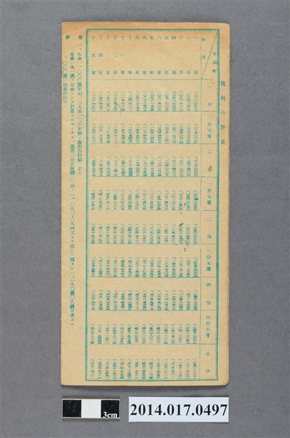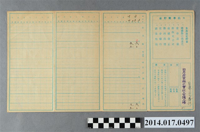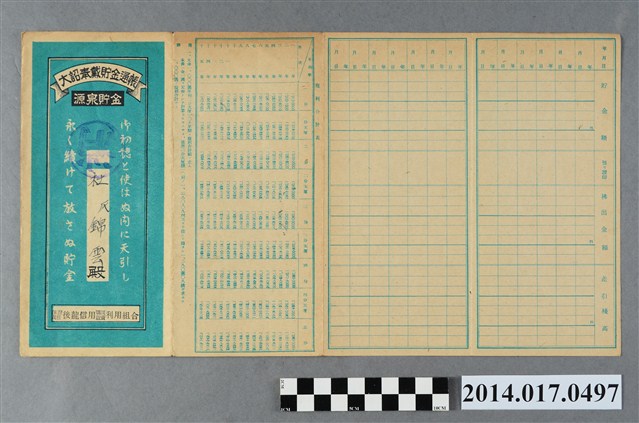 地址登載為後龍179番地。本物件為戰爭期間1943年~1945年期間後龍、公司寮、水尾子、二張犁、大山腳、頭湖、崎頂等地人民之銷帳儲金簿,內頁印有大詔奉戴字樣,並以婚葬儀式簡化、宴會遠慮、新謁見合せ、虛禮廢止、節酒節煙、徒步勵行、副業勉強倡導儲金,另外印有儲簿規定如:不許轉讓、改印需申請等,背頁附有複利合計表。大詔指的是1941年對美、英兩國之宣戰詔書,1942年起每個月8日定為大詔奉戴日,為日本政府為太平洋戰爭所運作的國民運動,隨著戰爭規模擴大,戰時有各項國民強迫儲蓄的舉措,以支援前線戰事,1938年日本政府為因應中日戰爭即推行有愛國儲蓄運動,本物件則為1942年後因應戰爭規模擴大後之儲蓄項目,范雅鈞指出本儲金簿為強制存款,直接由薪資扣除。