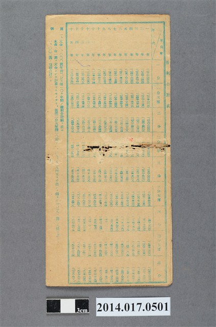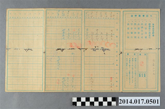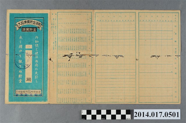 地址載為後龍345。本物件為戰爭期間1943年~1945年期間後龍、公司寮、水尾子、二張犁、大山腳、頭湖、崎頂等地人民之銷帳儲金簿,內頁印有大詔奉戴字樣,並以婚葬儀式簡化、宴會遠慮、新謁見合せ、虛禮廢止、節酒節煙、徒步勵行、副業勉強倡導儲金,另外印有儲簿規定如:不許轉讓、改印需申請等,背頁附有複利合計表。大詔指的是1941年對美、英兩國之宣戰詔書,1942年起每個月8日定為大詔奉戴日,為日本政府為太平洋戰爭所運作的國民運動,隨著戰爭規模擴大,戰時有各項國民強迫儲蓄的舉措,以支援前線戰事,1938年日本政府為因應中日戰爭即推行有愛國儲蓄運動,本物件則為1942年後因應戰爭規模擴大後之儲蓄項目,范雅鈞指出本儲金簿為強制存款,直接由薪資扣除。