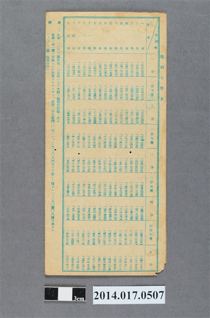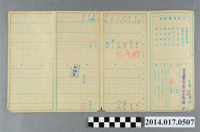 印有日月產業株式會社臺灣工廠字樣,地址登載為後龍185番地。本物件為戰爭期間1943年~1945年期間後龍、公司寮、水尾子、二張犁、大山腳、頭湖、崎頂等地人民之銷帳儲金簿,內頁印有大詔奉戴字樣,並以婚葬儀式簡化、宴會遠慮、新謁見合せ、虛禮廢止、節酒節煙、徒步勵行、副業勉強倡導儲金,另外印有儲簿規定如:不許轉讓、改印需申請等,背頁附有複利合計表。大詔指的是1941年對美、英兩國之宣戰詔書,1942年起每個月8日定為大詔奉戴日,為日本政府為太平洋戰爭所運作的國民運動,隨著戰爭規模擴大,戰時有各項國民強迫儲蓄的舉措,以支援前線戰事,1938年日本政府為因應中日戰爭即推行有愛國儲蓄運動,本物件則為1942年後因應戰爭規模擴大後之儲蓄項目,范雅鈞指出本儲金簿為強制存款,直接由薪資扣除。