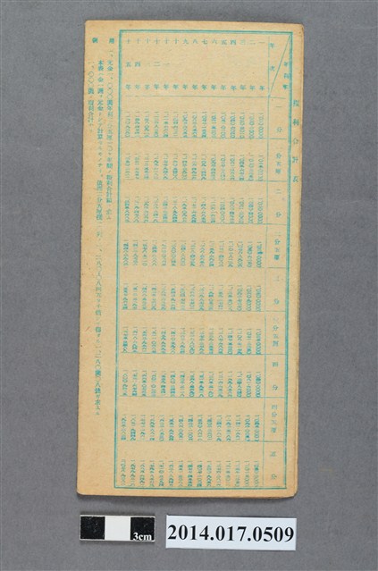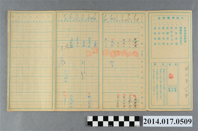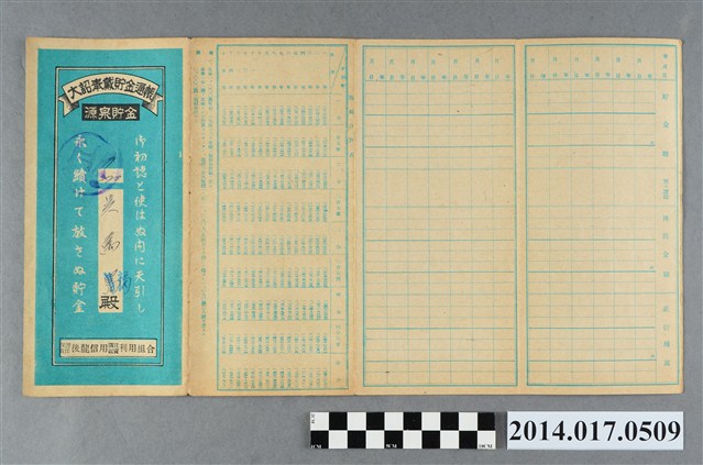 地址登載為田心子105。本物件為戰爭期間1943年~1945年期間後龍、公司寮、水尾子、二張犁、大山腳、頭湖、崎頂等地人民之銷帳儲金簿,內頁印有大詔奉戴字樣,並以婚葬儀式簡化、宴會遠慮、新謁見合せ、虛禮廢止、節酒節煙、徒步勵行、副業勉強倡導儲金,另外印有儲簿規定如:不許轉讓、改印需申請等,背頁附有複利合計表。大詔指的是1941年對美、英兩國之宣戰詔書,1942年起每個月8日定為大詔奉戴日,為日本政府為太平洋戰爭所運作的國民運動,隨著戰爭規模擴大,戰時有各項國民強迫儲蓄的舉措,以支援前線戰事,1938年日本政府為因應中日戰爭即推行有愛國儲蓄運動,本物件則為1942年後因應戰爭規模擴大後之儲蓄項目,范雅鈞指出本儲金簿為強制存款,直接由薪資扣除。