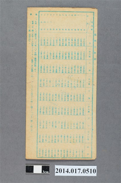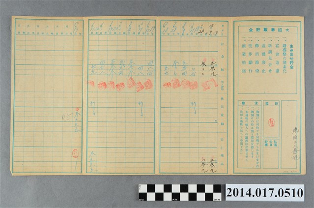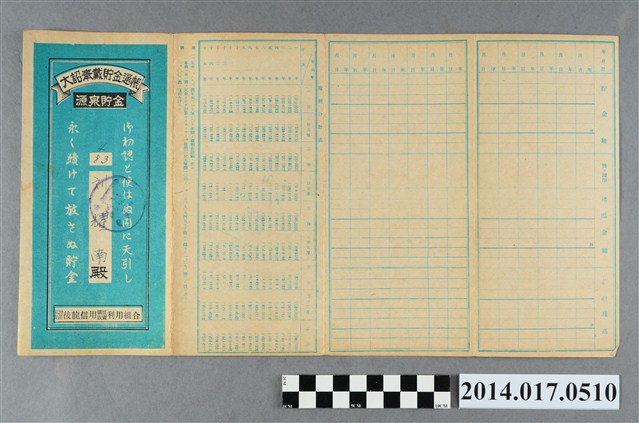 地址登載為東西38番地。本物件為戰爭期間1943年~1945年期間後龍、公司寮、水尾子、二張犁、大山腳、頭湖、崎頂等地人民之銷帳儲金簿,內頁印有大詔奉戴字樣,並以婚葬儀式簡化、宴會遠慮、新謁見合せ、虛禮廢止、節酒節煙、徒步勵行、副業勉強倡導儲金,另外印有儲簿規定如:不許轉讓、改印需申請等,背頁附有複利合計表。大詔指的是1941年對美、英兩國之宣戰詔書,1942年起每個月8日定為大詔奉戴日,為日本政府為太平洋戰爭所運作的國民運動,隨著戰爭規模擴大,戰時有各項國民強迫儲蓄的舉措,以支援前線戰事,1938年日本政府為因應中日戰爭即推行有愛國儲蓄運動,本物件則為1942年後因應戰爭規模擴大後之儲蓄項目,范雅鈞指出本儲金簿為強制存款,直接由薪資扣除。