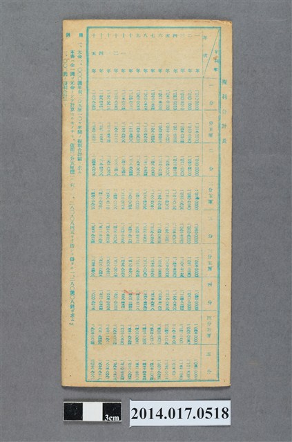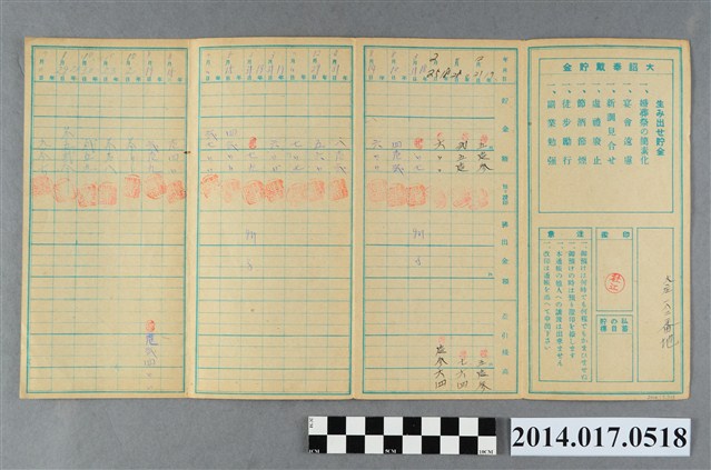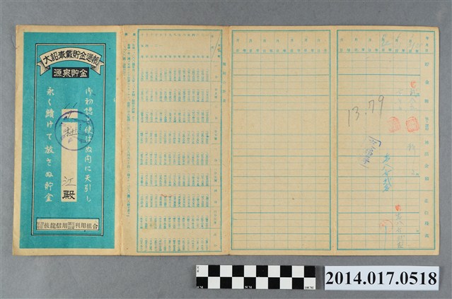 地址登載為大庄182。本物件為戰爭期間1943年~1945年期間後龍、公司寮、水尾子、二張犁、大山腳、頭湖、崎頂等地人民之銷帳儲金簿,內頁印有大詔奉戴字樣,並以婚葬儀式簡化、宴會遠慮、新謁見合せ、虛禮廢止、節酒節煙、徒步勵行、副業勉強倡導儲金,另外印有儲簿規定如:不許轉讓、改印需申請等,背頁附有複利合計表。大詔指的是1941年對美、英兩國之宣戰詔書,1942年起每個月8日定為大詔奉戴日,為日本政府為太平洋戰爭所運作的國民運動,隨著戰爭規模擴大,戰時有各項國民強迫儲蓄的舉措,以支援前線戰事,1938年日本政府為因應中日戰爭即推行有愛國儲蓄運動,本物件則為1942年後因應戰爭規模擴大後之儲蓄項目,范雅鈞指出本儲金簿為強制存款,直接由薪資扣除。