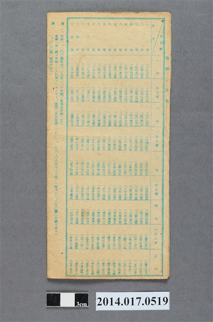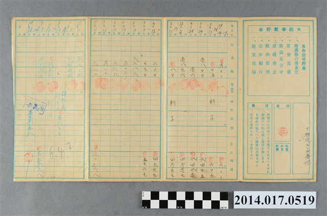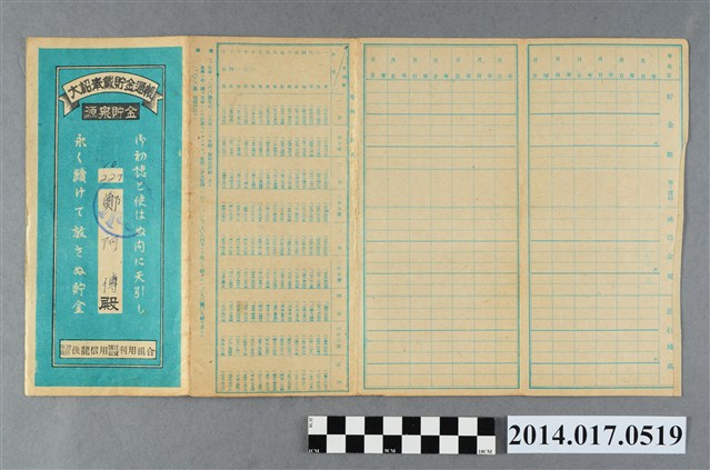 地址登載為十班坑504。本物件為戰爭期間1943年~1945年期間後龍、公司寮、水尾子、二張犁、大山腳、頭湖、崎頂等地人民之銷帳儲金簿,內頁印有大詔奉戴字樣,並以婚葬儀式簡化、宴會遠慮、新謁見合せ、虛禮廢止、節酒節煙、徒步勵行、副業勉強倡導儲金,另外印有儲簿規定如:不許轉讓、改印需申請等,背頁附有複利合計表。大詔指的是1941年對美、英兩國之宣戰詔書,1942年起每個月8日定為大詔奉戴日,為日本政府為太平洋戰爭所運作的國民運動,隨著戰爭規模擴大,戰時有各項國民強迫儲蓄的舉措,以支援前線戰事,1938年日本政府為因應中日戰爭即推行有愛國儲蓄運動,本物件則為1942年後因應戰爭規模擴大後之儲蓄項目,范雅鈞指出本儲金簿為強制存款,直接由薪資扣除。