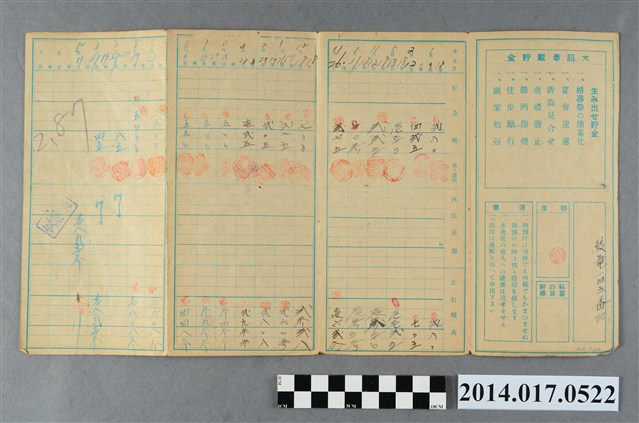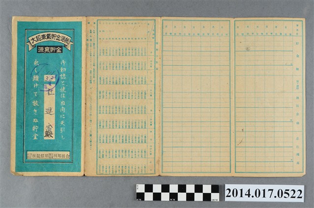 地址登載為後龍145番地。本物件為戰爭期間1943年~1945年期間後龍、公司寮、水尾子、二張犁、大山腳、頭湖、崎頂等地人民之銷帳儲金簿,內頁印有大詔奉戴字樣,並以婚葬儀式簡化、宴會遠慮、新謁見合せ、虛禮廢止、節酒節煙、徒步勵行、副業勉強倡導儲金,另外印有儲簿規定如:不許轉讓、改印需申請等,背頁附有複利合計表。大詔指的是1941年對美、英兩國之宣戰詔書,1942年起每個月8日定為大詔奉戴日,為日本政府為太平洋戰爭所運作的國民運動,隨著戰爭規模擴大,戰時有各項國民強迫儲蓄的舉措,以支援前線戰事,1938年日本政府為因應中日戰爭即推行有愛國儲蓄運動,本物件則為1942年後因應戰爭規模擴大後之儲蓄項目,范雅鈞指出本儲金簿為強制存款,直接由薪資扣除。