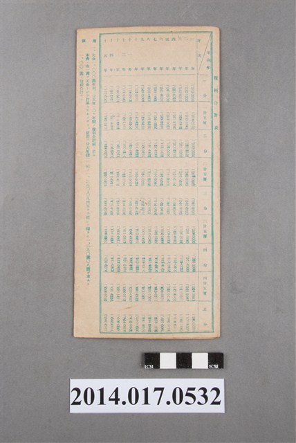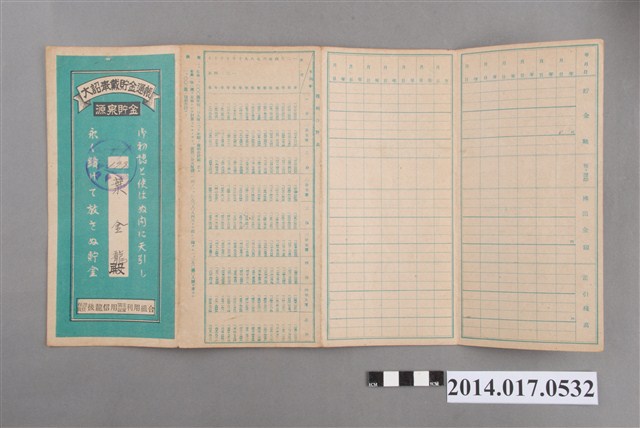地址登載為田心子102。本物件為戰爭期間1943年~1945年期間後龍、公司寮、水尾子、二張犁、大山腳、頭湖、崎頂等地人民之銷帳儲金簿,內頁印有大詔奉戴字樣,並以婚葬儀式簡化、宴會遠慮、新謁見合せ、虛禮廢止、節酒節煙、徒步勵行、副業勉強倡導儲金,另外印有儲簿規定如:不許轉讓、改印需申請等,背頁附有複利合計表。大詔指的是1941年對美、英兩國之宣戰詔書,1942年起每個月8日定為大詔奉戴日,為日本政府為太平洋戰爭所運作的國民運動,隨著戰爭規模擴大,戰時有各項國民強迫儲蓄的舉措,以支援前線戰事,1938年日本政府為因應中日戰爭即推行有愛國儲蓄運動,本物件則為1942年後因應戰爭規模擴大後之儲蓄項目,范雅鈞指出本儲金簿為強制存款,直接由薪資扣除。