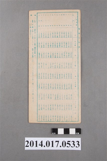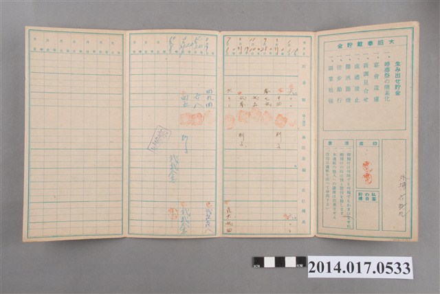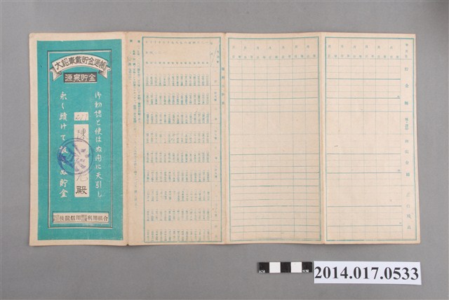 地址登載為外埔659。本物件為戰爭期間1943年~1945年期間後龍、公司寮、水尾子、二張犁、大山腳、頭湖、崎頂等地人民之銷帳儲金簿,內頁印有大詔奉戴字樣,並以婚葬儀式簡化、宴會遠慮、新謁見合せ、虛禮廢止、節酒節煙、徒步勵行、副業勉強倡導儲金,另外印有儲簿規定如:不許轉讓、改印需申請等,背頁附有複利合計表。大詔指的是1941年對美、英兩國之宣戰詔書,1942年起每個月8日定為大詔奉戴日,為日本政府為太平洋戰爭所運作的國民運動,隨著戰爭規模擴大,戰時有各項國民強迫儲蓄的舉措,以支援前線戰事,1938年日本政府為因應中日戰爭即推行有愛國儲蓄運動,本物件則為1942年後因應戰爭規模擴大後之儲蓄項目,范雅鈞指出本儲金簿為強制存款,直接由薪資扣除。