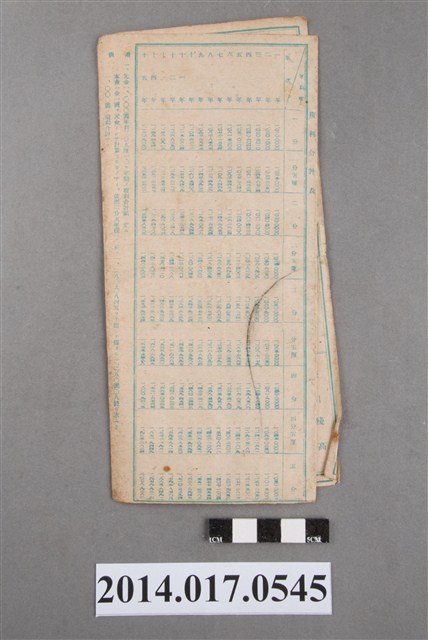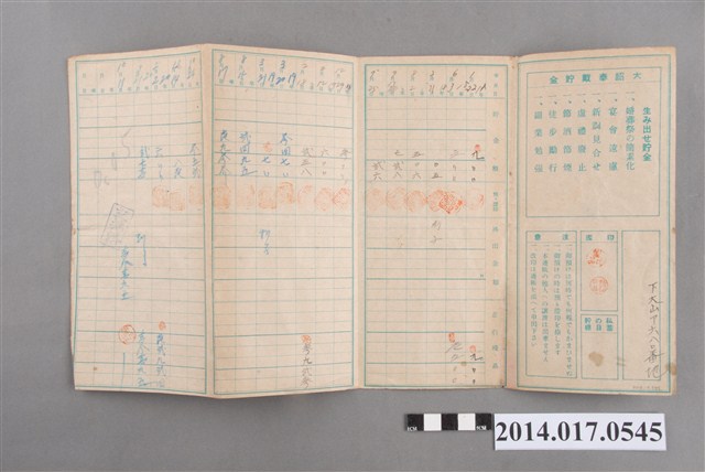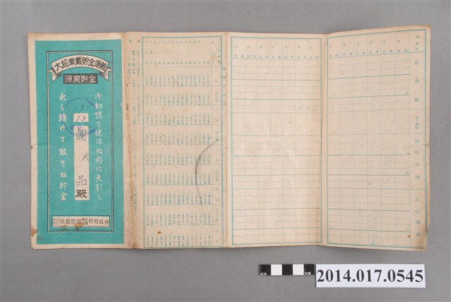 地址登載為下大山ア680番地。本物件為戰爭期間1943年~1945年期間後龍、公司寮、水尾子、二張犁、大山腳、頭湖、崎頂等地人民之銷帳儲金簿,內頁印有大詔奉戴字樣,並以婚葬儀式簡化、宴會遠慮、新謁見合せ、虛禮廢止、節酒節煙、徒步勵行、副業勉強倡導儲金,另外印有儲簿規定如:不許轉讓、改印需申請等,背頁附有複利合計表。大詔指的是1941年對美、英兩國之宣戰詔書,1942年起每個月8日定為大詔奉戴日,為日本政府為太平洋戰爭所運作的國民運動,隨著戰爭規模擴大,戰時有各項國民強迫儲蓄的舉措,以支援前線戰事,1938年日本政府為因應中日戰爭即推行有愛國儲蓄運動,本物件則為1942年後因應戰爭規模擴大後之儲蓄項目,范雅鈞指出本儲金簿為強制存款,直接由薪資扣除。