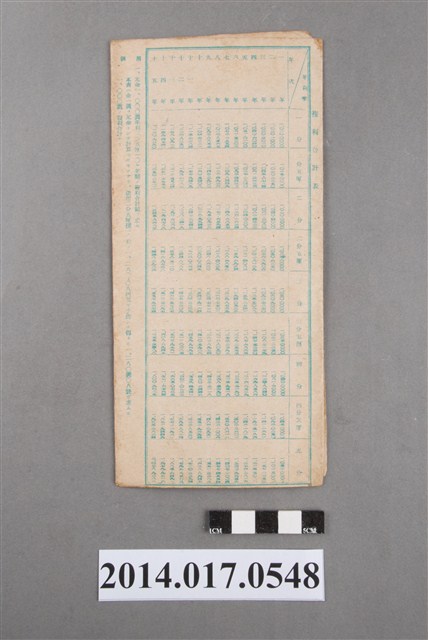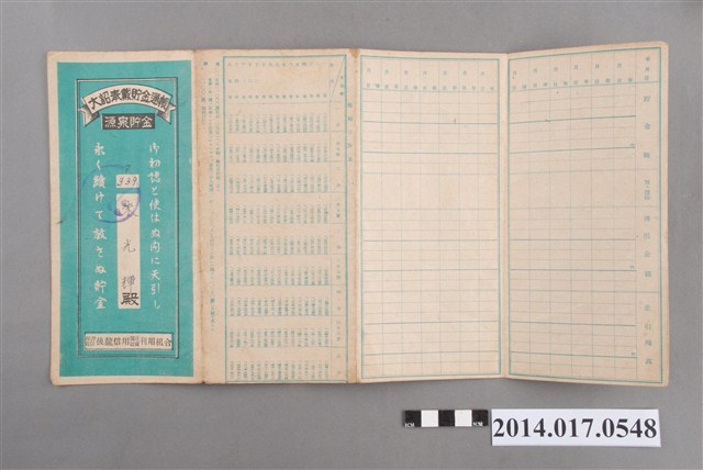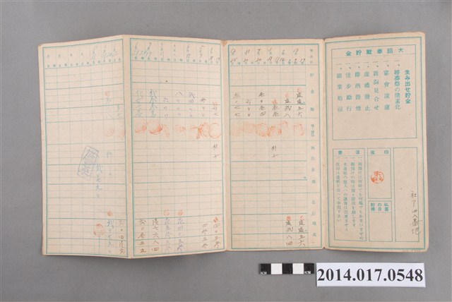 地址登載為社ア48番地。本物件為戰爭期間1943年~1945年期間後龍、公司寮、水尾子、二張犁、大山腳、頭湖、崎頂等地人民之銷帳儲金簿,內頁印有大詔奉戴字樣,並以婚葬儀式簡化、宴會遠慮、新謁見合せ、虛禮廢止、節酒節煙、徒步勵行、副業勉強倡導儲金,另外印有儲簿規定如:不許轉讓、改印需申請等,背頁附有複利合計表。大詔指的是1941年對美、英兩國之宣戰詔書,1942年起每個月8日定為大詔奉戴日,為日本政府為太平洋戰爭所運作的國民運動,隨著戰爭規模擴大,戰時有各項國民強迫儲蓄的舉措,以支援前線戰事,1938年日本政府為因應中日戰爭即推行有愛國儲蓄運動,本物件則為1942年後因應戰爭規模擴大後之儲蓄項目,范雅鈞指出本儲金簿為強制存款,直接由薪資扣除。