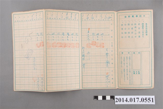 姓名欄中姓氏辨識不清。本物件為戰爭期間1943年~1945年期間後龍、公司寮、水尾子、二張犁、大山腳、頭湖、崎頂等地人民之銷帳儲金簿,內頁印有大詔奉戴字樣,並以婚葬儀式簡化、宴會遠慮、新謁見合せ、虛禮廢止、節酒節煙、徒步勵行、副業勉強倡導儲金,另外印有儲簿規定如:不許轉讓、改印需申請等,背頁附有複利合計表。大詔指的是1941年對美、英兩國之宣戰詔書,1942年起每個月8日定為大詔奉戴日,為日本政府為太平洋戰爭所運作的國民運動,隨著戰爭規模擴大,戰時有各項國民強迫儲蓄的舉措,以支援前線戰事,1938年日本政府為因應中日戰爭即推行有愛國儲蓄運動,本物件則為1942年後因應戰爭規模擴大後之儲蓄項目,范雅鈞指出本儲金簿為強制存款,直接由薪資扣除。