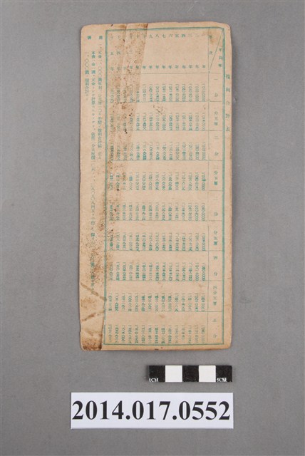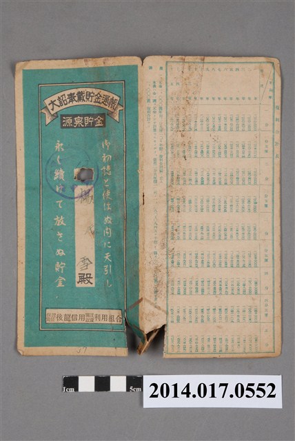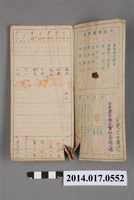 印有日月產業株式會社臺灣工廠,地址載為後龍205番地。本物件為戰爭期間1943年~1945年期間後龍、公司寮、水尾子、二張犁、大山腳、頭湖、崎頂等地人民之銷帳儲金簿,內頁印有大詔奉戴字樣,並以婚葬儀式簡化、宴會遠慮、新謁見合せ、虛禮廢止、節酒節煙、徒步勵行、副業勉強倡導儲金,另外印有儲簿規定如:不許轉讓、改印需申請等,背頁附有複利合計表。大詔指的是1941年對美、英兩國之宣戰詔書,1942年起每個月8日定為大詔奉戴日,為日本政府為太平洋戰爭所運作的國民運動,隨著戰爭規模擴大,戰時有各項國民強迫儲蓄的舉措,以支援前線戰事,1938年日本政府為因應中日戰爭即推行有愛國儲蓄運動,本物件則為1942年後因應戰爭規模擴大後之儲蓄項目,范雅鈞指出本儲金簿為強制存款,直接由薪資扣除。