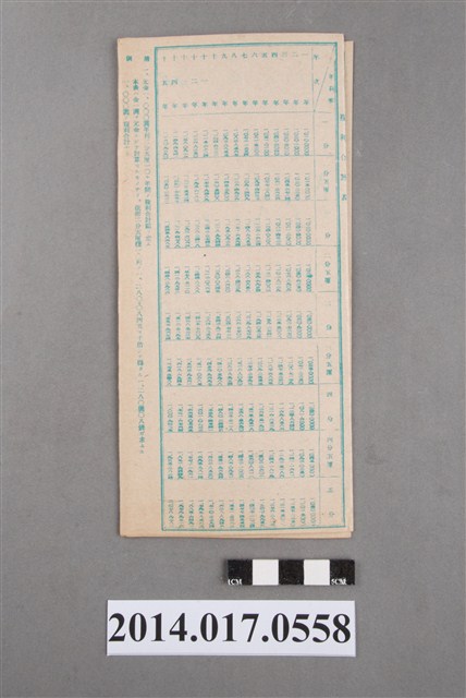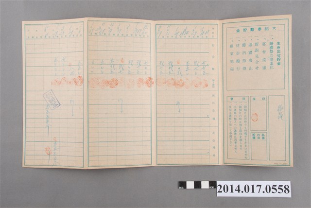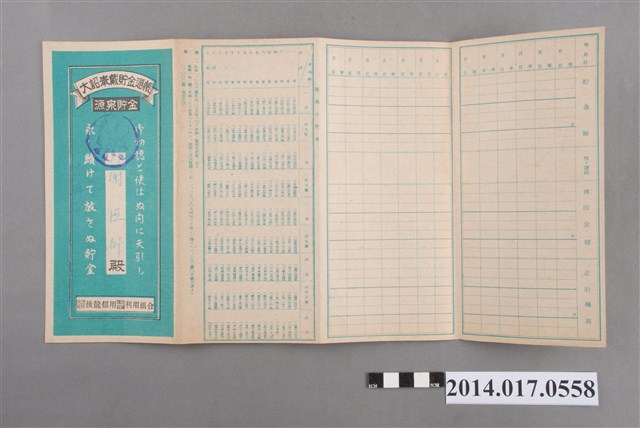 本物件為戰爭期間1943年~1945年期間後龍、公司寮、水尾子、二張犁、大山腳、頭湖、崎頂等地人民之銷帳儲金簿,內頁印有大詔奉戴字樣,並以婚葬儀式簡化、宴會遠慮、新謁見合せ、虛禮廢止、節酒節煙、徒步勵行、副業勉強倡導儲金,另外印有儲簿規定如:不許轉讓、改印需申請等,背頁附有複利合計表。大詔指的是1941年對美、英兩國之宣戰詔書,1942年起每個月8日定為大詔奉戴日,為日本政府為太平洋戰爭所運作的國民運動,隨著戰爭規模擴大,戰時有各項國民強迫儲蓄的舉措,以支援前線戰事,1938年日本政府為因應中日戰爭即推行有愛國儲蓄運動,本物件則為1942年後因應戰爭規模擴大後之儲蓄項目,范雅鈞指出本儲金簿為強制存款,直接由薪資扣除。