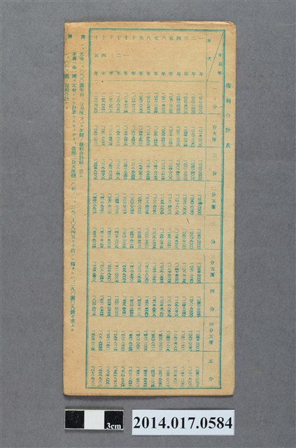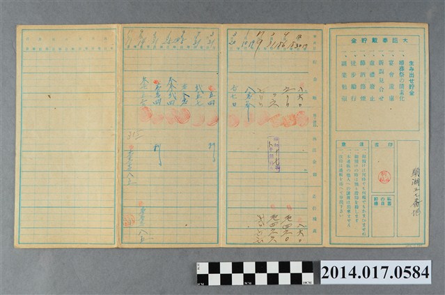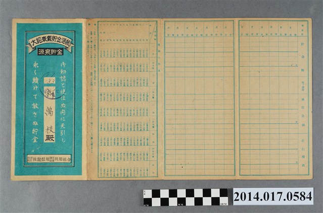 地址載為頭湖57番地。本物件為戰爭期間1943年~1945年期間後龍、公司寮、水尾子、二張犁、大山腳、頭湖、崎頂等地人民之銷帳儲金簿,內頁印有大詔奉戴字樣,並以婚葬儀式簡化、宴會遠慮、新謁見合せ、虛禮廢止、節酒節煙、徒步勵行、副業勉強倡導儲金,另外印有儲簿規定如:不許轉讓、改印需申請等,背頁附有複利合計表。大詔指的是1941年對美、英兩國之宣戰詔書,1942年起每個月8日定為大詔奉戴日,為日本政府為太平洋戰爭所運作的國民運動,隨著戰爭規模擴大,戰時有各項國民強迫儲蓄的舉措,以支援前線戰事,1938年日本政府為因應中日戰爭即推行有愛國儲蓄運動,本物件則為1942年後因應戰爭規模擴大後之儲蓄項目,范雅鈞指出本儲金簿為強制存款,直接由薪資扣除。