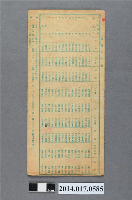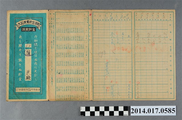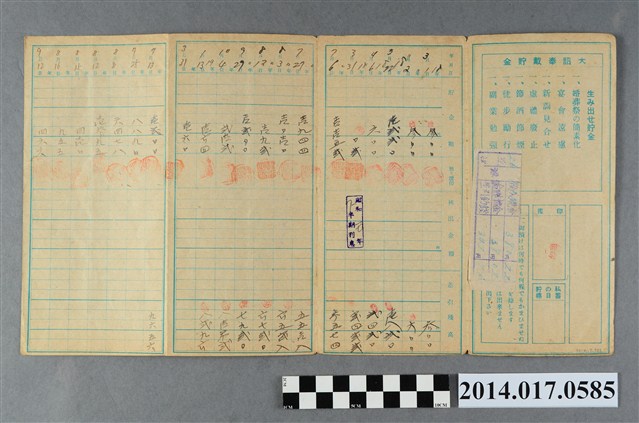 本物件為戰爭期間1943年~1945年期間後龍、公司寮、水尾子、二張犁、大山腳、頭湖、崎頂等地人民之銷帳儲金簿,內頁印有大詔奉戴字樣,並以婚葬儀式簡化、宴會遠慮、新謁見合せ、虛禮廢止、節酒節煙、徒步勵行、副業勉強倡導儲金,另外印有儲簿規定如:不許轉讓、改印需申請等,背頁附有複利合計表。大詔指的是1941年對美、英兩國之宣戰詔書,1942年起每個月8日定為大詔奉戴日,為日本政府為太平洋戰爭所運作的國民運動,隨著戰爭規模擴大,戰時有各項國民強迫儲蓄的舉措,以支援前線戰事,1938年日本政府為因應中日戰爭即推行有愛國儲蓄運動,本物件則為1942年後因應戰爭規模擴大後之儲蓄項目,范雅鈞指出本儲金簿為強制存款,直接由薪資扣除。