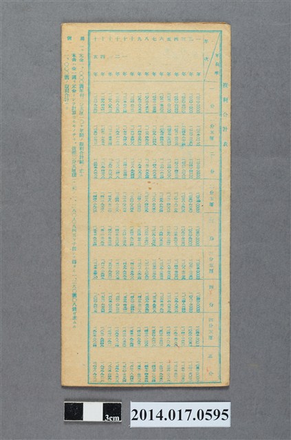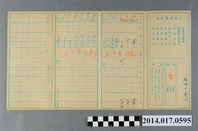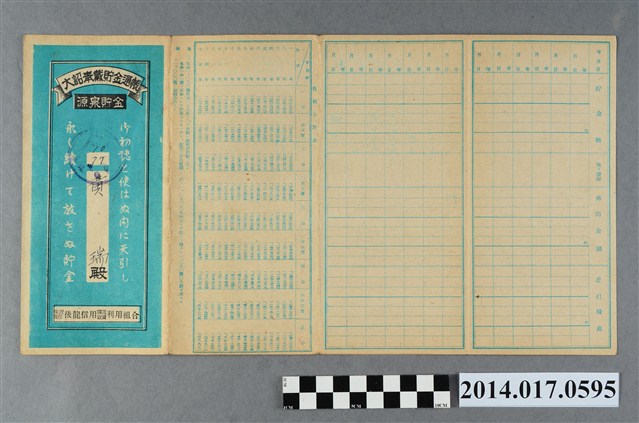 地址載為頭湖57番地。本物件為戰爭期間1943年~1945年期間後龍、公司寮、水尾子、二張犁、大山腳、頭湖、崎頂等地人民之銷帳儲金簿,內頁印有大詔奉戴字樣,並以婚葬儀式簡化、宴會遠慮、新謁見合せ、虛禮廢止、節酒節煙、徒步勵行、副業勉強倡導儲金,另外印有儲簿規定如:不許轉讓、改印需申請等,背頁附有複利合計表。大詔指的是1941年對美、英兩國之宣戰詔書,1942年起每個月8日定為大詔奉戴日,為日本政府為太平洋戰爭所運作的國民運動,隨著戰爭規模擴大,戰時有各項國民強迫儲蓄的舉措,以支援前線戰事,1938年日本政府為因應中日戰爭即推行有愛國儲蓄運動,本物件則為1942年後因應戰爭規模擴大後之儲蓄項目,范雅鈞指出本儲金簿為強制存款,直接由薪資扣除。