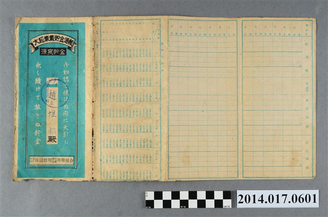 地址載為頭湖83番地。本物件為戰爭期間1943年~1945年期間後龍、公司寮、水尾子、二張犁、大山腳、頭湖、崎頂等地人民之銷帳儲金簿,內頁印有大詔奉戴字樣,並以婚葬儀式簡化、宴會遠慮、新謁見合せ、虛禮廢止、節酒節煙、徒步勵行、副業勉強倡導儲金,另外印有儲簿規定如:不許轉讓、改印需申請等,背頁附有複利合計表。大詔指的是1941年對美、英兩國之宣戰詔書,1942年起每個月8日定為大詔奉戴日,為日本政府為太平洋戰爭所運作的國民運動,隨著戰爭規模擴大,戰時有各項國民強迫儲蓄的舉措,以支援前線戰事,1938年日本政府為因應中日戰爭即推行有愛國儲蓄運動,本物件則為1942年後因應戰爭規模擴大後之儲蓄項目,范雅鈞指出本儲金簿為強制存款,直接由薪資扣除。