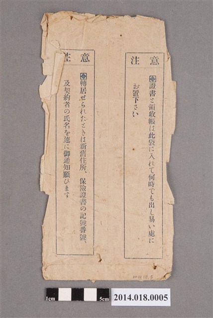 為侯俊卿先生於昭和時期,放置保險契約證書及相關領受證的收納紙袋。紙袋正面寫有契約人侯俊卿先生的姓名及聯絡地址,以及當時臺南郵便局的聯絡番號;紙袋背面則寫有注意事項,並告知契約人可把保險契約及相關的領收證放置於此處,且若聯絡地址有所改易,須告知保險當局。