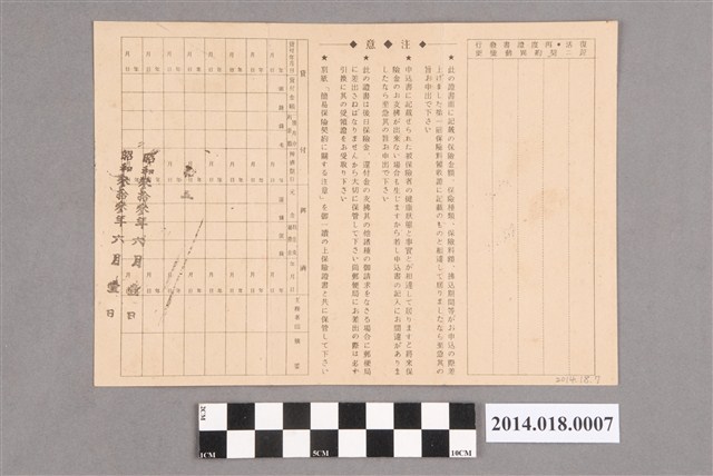 為日治昭和時期,侯俊卿先生於臺南郵便局辦理保險的保險證明書。保險種類為15年的養老保險,保險證書寫有保險的時間:昭和18年6月2日。另寫有被保險人、保險金額及保險的期限;證書的背面,則寫有此一保險的注意事項。