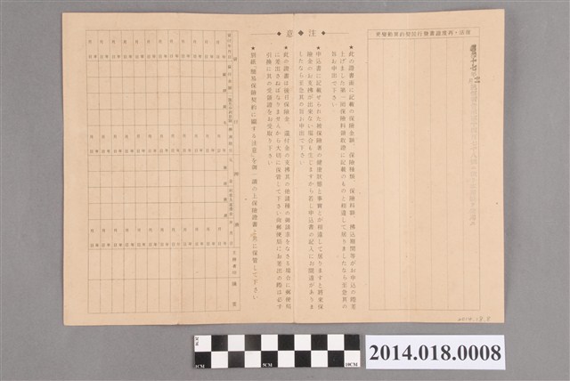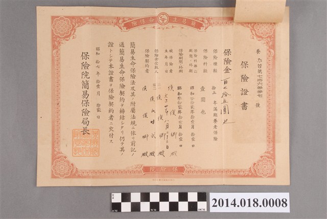 為日治昭和時期,侯俊卿先生於臺南郵便局辦理保險的保險證明書。保險種類為15年的養老保險,保險證書寫有保險的時間:昭和17年11月12日。另寫有被保險人、保險金收取人、保險金額及保險的期限;同時證書的右上角,另附有臺南郵便局國民貯蓄的相關說明;而證書的背面,則寫有此一保險的注意事項。