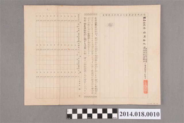 為日治昭和時期,侯俊卿先生於臺南郵便局辦理保險的保險證明書。保險種類為終身保險,保險證書寫有保險的時間:昭和9年10月8日。另寫有被保險人、保險金收取人、保險金額及保險的期限;而證書的背面,則留有保險金收取人變更的註明,以及此一保險的相關注意事項。