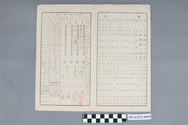 2. 本件封面印刷與書寫文字:「昭和十八年度 家庭通信票 臺南師範學校附屬國民學校 初等科第五學年(第一三學級) 第十八號 林俊雄」。內頁右側為學校職員名錄,包括校長、主事、總務、各學科與學級擔任老施姓名。左側則為初等科第五學年學業成績與身體狀況紀錄:學業成績多為優或良,導師評語:「惟體育科待磨練加強」。最末頁為通信欄與兒童體位紀錄:通信欄空白,兒童體位記錄第1-3學期100公尺短跑、跳高與跳遠、短棒投擲、手臂懸吊力測試結果。本件無記錄成績批核時間。