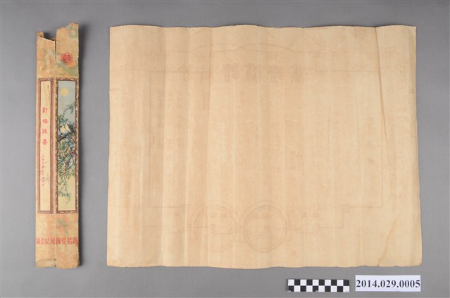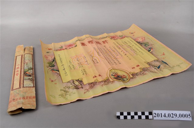 胡宇傑先生與李澤信女士訂婚證書,證書寫明雙方出生年月與籍貫,於民國34年9月4日2時於貴陽締結良緣,證書上尚有訂婚人、證明人、介紹人、主婚人等簽名蓋章。物件橫式長方彩色印刷,捐贈者摺疊收藏,摺痕明顯,物件附有一山盟海誓字樣與花鳥紋圖樣紙盒。