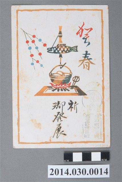 1. 本件為王添福先生日治時期就讀臺南寶公學校的老師濱田弘自日本廣島寄給臺南市西門路王添福的賀年卡。明信片正面之郵戳時間為1975年3月12日,正面以毛筆書寫姓名、地址,背面則以彩色繪製「賀春、祈御發展」文字與梅花、鯉魚、爐火燒火鍋之日式吉祥圖案。明信片右下角被臺灣郵局蓋「請用標準信封」戳印。