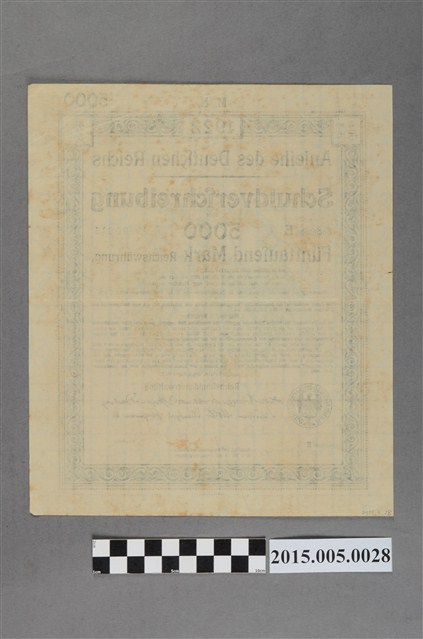 面額上顯示自1925年11月1日起清償,至1930年10月31日償還完畢。德國於1次大戰戰敗,戰後為因應大量戰爭賠償,大量印製鈔票及債券,因此造成通貨膨脹,1923年11月前甚至發行1兆馬克之情形,1923年後重新發行土地馬克等,方才結束通貨膨脹。有一說法為德國賠償當時戰勝國日本此類舊德國馬克,日本政府因此將之轉由殖民地韓國臺灣等地之人民購買吸收。戰後日本政府主張此為貨幣非債券,且政府從未正式公告將此類紙鈔轉售人民,1920年代日本即有德國馬克詐騙事件,推測臺灣也是相關的情形。臺灣方面則有人宣稱當初是殖民政府透過警察及保甲購買此類舊馬克,從1968起年就有人自行與日本官方交涉,1975年起有人自發組團赴日討債,也到內政部和立法院前抗爭十多次,仍無結果。在1984年前後,台日即將交涉成功的傳聞甚囂塵上,造成「舊德國馬克」價格狂飆,又掀起一股搶購熱潮,結果日本政府態度堅決,搶購馬克者慘遭套牢。後來有人組成中華民國研究日據時代德國舊馬克協會,積極組織希望日本賠償,並宣稱日本1964年起已經陸續賠償韓國琉球、菲律賓、馬來西亞、新加坡此類持有馬克「債券」者。根據評估人在臺灣日日新報,也見有1924年開始有人在臺中利用這批馬克進行詐騙之事件,推測日方政府所說應有部分事實根據。根據一些研究之檢證,認為一戰德國總賠償金額原根據1919年巴黎和會初議是1200億馬克 * 600億黃金馬克(Goldmark)+600億紙幣(Papiermark)(而且其中對日賠款部份僅佔0.75%)且其後德國無法順利償還之故,由大債主美國主導下有1924年的道斯計劃,到1929年楊格計畫一路減免其賠償金額,日本也沒可能那麼快入手那麼多馬克。另外日治時期日本政府的確發行過不少國庫債券,但只有以日文書寫日本所發行,由官方推銷印著敵對國且戰敗國的「鈔票」,應該是不太可能。評估人認為這些德國馬克(多數是馬克非債券)極有可能是若干詐騙集團入手這些德國馬克後,至日本及各殖民地進行詐騙的可能較高,此與日本在二戰時發行之債券與儲金問題不可一概而論,日本本國發行債券及儲金問題日本已片面決定賠償比例並陸續要求臺灣持有人提出賠償要求。甚至可能是戰後由於有謠傳日方要賠償此類德國馬克,因此在1980年代又出現一波購買潮。顯示了此類馬克在戰前戰後均有其流行的歷史。