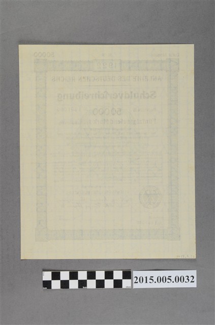 面額上顯示自1925年11月1日起清償,至1930年10月31日償還完畢。德國於1次大戰戰敗,戰後為因應大量戰爭賠償,大量印製鈔票及債券,因此造成通貨膨脹,1923年11月前甚至發行1兆馬克之情形,1923年後重新發行土地馬克等,方才結束通貨膨脹。有一說法為德國賠償當時戰勝國日本此類舊德國馬克,日本政府因此將之轉由殖民地韓國臺灣等地之人民購買吸收。戰後日本政府主張此為貨幣非債券,且政府從未正式公告將此類紙鈔轉售人民,1920年代日本即有德國馬克詐騙事件,推測臺灣也是相關的情形。臺灣方面則有人宣稱當初是殖民政府透過警察及保甲購買此類舊馬克,從1968起年就有人自行與日本官方交涉,1975年起有人自發組團赴日討債,也到內政部和立法院前抗爭十多次,仍無結果。在1984年前後,台日即將交涉成功的傳聞甚囂塵上,造成「舊德國馬克」價格狂飆,又掀起一股搶購熱潮,結果日本政府態度堅決,搶購馬克者慘遭套牢。後來有人組成中華民國研究日據時代德國舊馬克協會,積極組織希望日本賠償,並宣稱日本1964年起已經陸續賠償韓國琉球、菲律賓、馬來西亞、新加坡此類持有馬克「債券」者。根據評估人在臺灣日日新報,也見有1924年開始有人在臺中利用這批馬克進行詐騙之事件,推測日方政府所說應有部分事實根據。根據一些研究之檢證,認為一戰德國總賠償金額原根據1919年巴黎和會初議是1200億馬克 * 600億黃金馬克(Goldmark)+600億紙幣(Papiermark)(而且其中對日賠款部份僅佔0.75%)且其後德國無法順利償還之故,由大債主美國主導下有1924年的道斯計劃,到1929年楊格計畫一路減免其賠償金額,日本也沒可能那麼快入手那麼多馬克。另外日治時期日本政府的確發行過不少國庫債券,但只有以日文書寫日本所發行,由官方推銷印著敵對國且戰敗國的「鈔票」,應該是不太可能。評估人認為這些德國馬克(多數是馬克非債券)極有可能是若干詐騙集團入手這些德國馬克後,至日本及各殖民地進行詐騙的可能較高,此與日本在二戰時發行之債券與儲金問題不可一概而論,日本本國發行債券及儲金問題日本已片面決定賠償比例並陸續要求臺灣持有人提出賠償要求。甚至可能是戰後由於有謠傳日方要賠償此類德國馬克,因此在1980年代又出現一波購買潮。顯示了此類馬克在戰前戰後均有其流行的歷史。