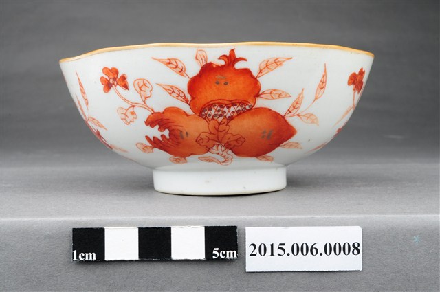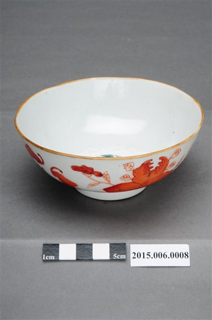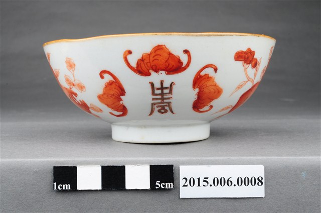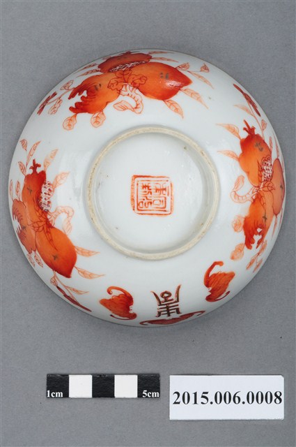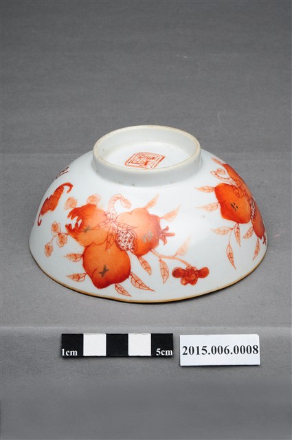 1. 紅釉福壽雙全多子多孫碗,口徑約12公分,器高4.5公分,為盛裝飯菜的小碗。內底中央以粉彩彩繪蟠桃與桃葉,碗外壁以橙紅色釉繪蝙蝠、壽字、佛手瓜、石榴等中國傳統吉祥圖案,象徵福壽雙全、多子多孫之意。湯碗口沿帶一圈黃釉,碗底有一0.5公分高之圈足,中央蓋有「同治年制」四字篆體方形朱印底款。本件瓷碗作工精細,器壁甚薄,全件以手工釉上彩彩繪,彩繪圖案輪廓描筆細緻,筆觸最細約<1mm,圈足底接觸面可見白色胎裡,除接觸面外,釉料滿塗。