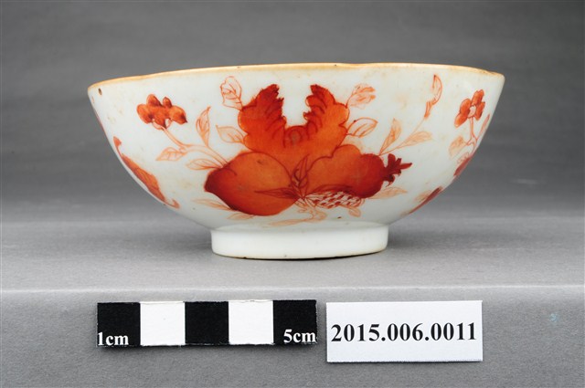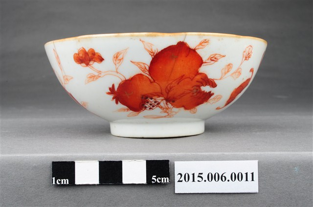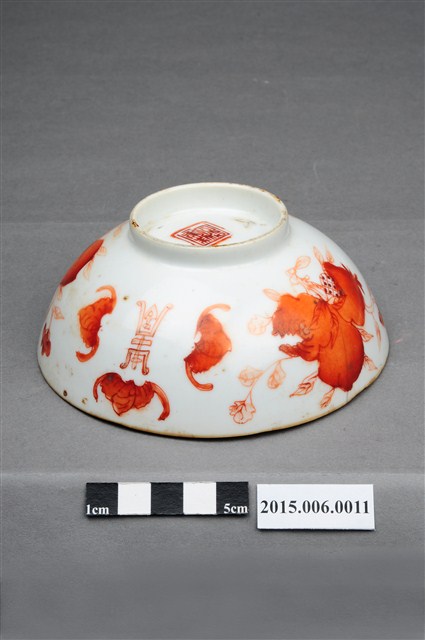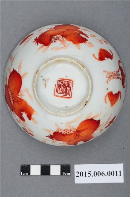 1. 紅釉福壽雙全多子多孫碗,口徑約12公分,器高4.5公分,為盛裝飯菜的小碗。內底中央以粉彩彩繪蟠桃與桃葉,碗外壁以橙紅色釉繪蝙蝠、壽字、佛手瓜、石榴等中國傳統吉祥圖案,象徵福壽雙全、多子多孫之意。湯碗口沿帶一圈黃釉,碗底有一0.5公分高之圈足,中央蓋有「同治年制」四字篆體方形朱印底款。本件瓷碗作工精細,器壁甚薄,全件以手工釉上彩彩繪,彩繪圖案輪廓描筆細緻,筆觸最細約<1mm,圈足底接觸面可見白色胎裡,除接觸面外,釉料滿塗。
