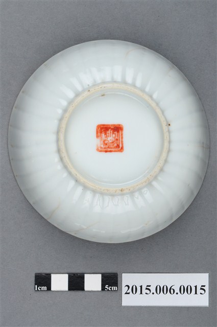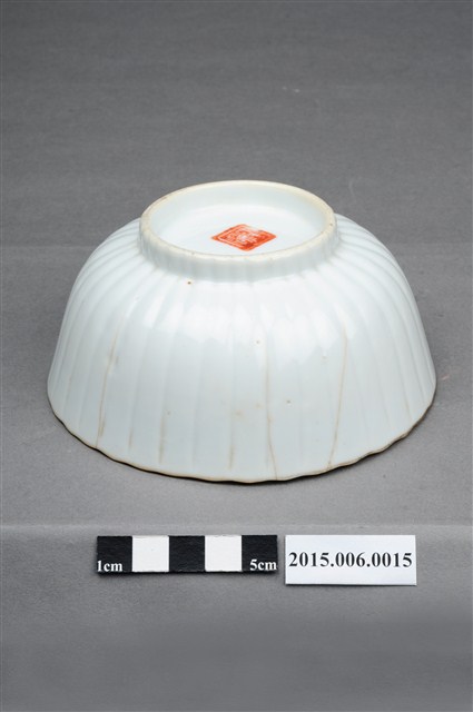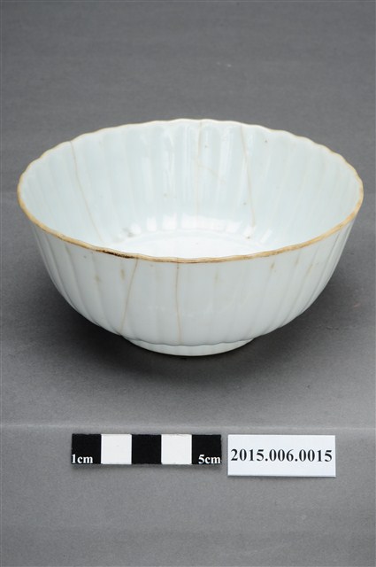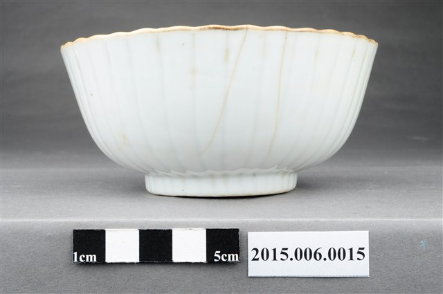 1. 白釉紋碗,口徑12公分,器高5公分,為盛裝飯菜用之小碗。胎體薄,碗壁作花瓣波浪形淺紋。器身通體施白釉,內外無任何彩繪,口沿帶有一周黃釉彩,器身內外帶有少許燒製所致之凹點,口沿帶有4-5條裂紋。器底中央蓋有「同治年制」四字篆體方形朱印底款。圈足底接觸面可見白色胎裡,除接觸面外釉料滿塗。