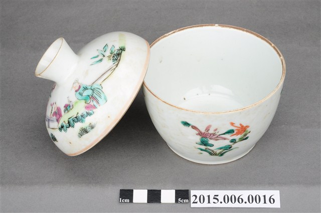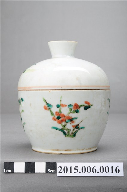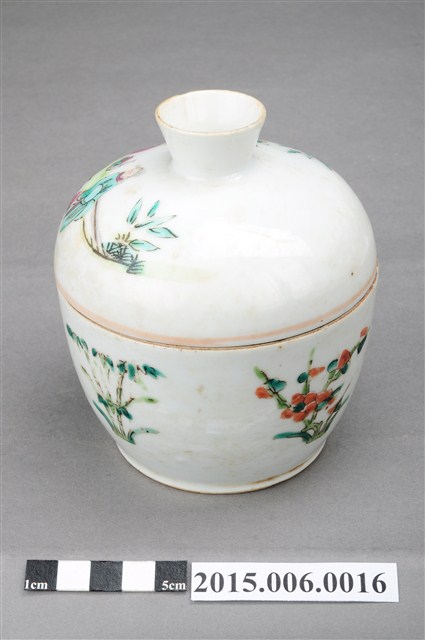 2. 本件罐蓋與罐身彩繪用色、畫風略有差異,罐身彩繪用色較罐蓋濃厚,推測可能為不同的工匠所繪製。器底雖無款識,但繪畫風格類似同批捐贈品其他有識款之碗盤,推測為清末民窯仿製官窯器型之粉彩瓷器,清末或日治初期彰化快官張家購買自中國進口之民用陶瓷器。