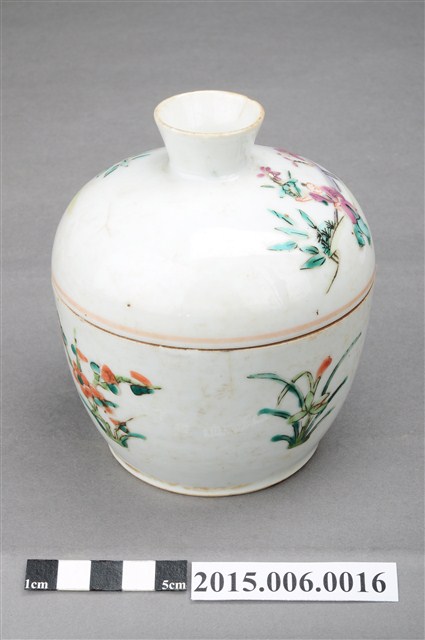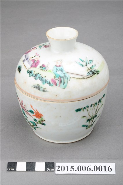 1. 粉彩梅蘭菊竹與人物紋附蓋罐,此形制之蓋罐又稱「糖罐」為清代中國江南地區婚嫁迎娶時裝糖果招待賓客的瓷器器型。本件胎體薄,通體施白釉,手工繪製釉上彩,粉彩彩繪。罐蓋直徑10.3cm,高5cm,蓋頂以墨筆及紫紅、淺綠、黃橙等色粉彩繪一書生與兩名書僮於花園賞花情景,象徵文人清逸風雅。罐身直徑亦為10.3cm,高6.5cm,器身外側以橙紅、墨綠、淺綠等色粉彩繪梅、蘭、竹、菊四君子,器底無款識。