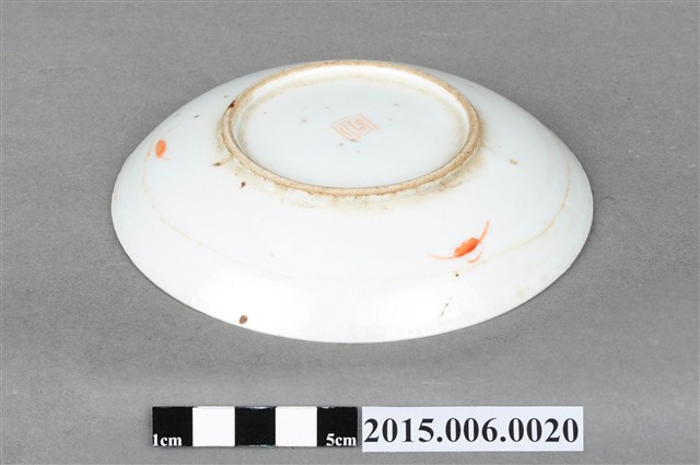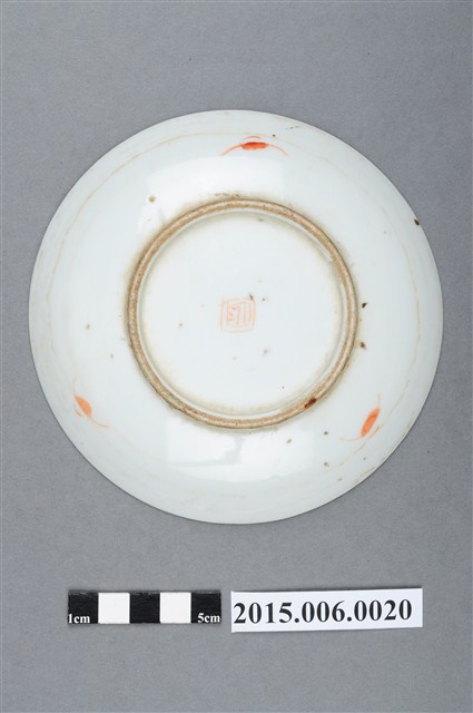 2. 本組瓷盤為捐贈者之婆婆承襲彰化快官張氏家族之物品,由於彩繪及墨書筆法較為草率,推測為清末民窯仿製官窯器型所出粉彩梅蘭竹菊壽桃盤,或外國仿製中國瓷盤,進口至臺灣成為民用陶瓷器。