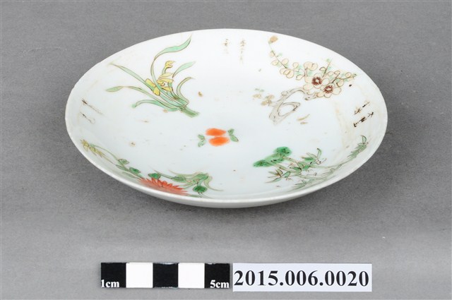1. 粉彩梅蘭菊竹蟠桃紋盤,為盛裝菜餚的圓形淺盤。盤面直徑13.5cm,高1.5cm,胎體薄,通體施白釉,手工繪製釉上彩,繪製方式先以極細墨筆勾勒出花草輪廓,再以橙紅、淺綠、淺黃、米白等色粉彩彩繪上色,碟內中央繪一壽桃,周緣繪梅、蘭、竹、菊四君子,花草圖案間以墨書題字,分別為「冬梅玉雪壽」、「?月?佳色」、「???風濤」、「其????」,字跡潦草難以識別。盤背面外緣以紅釉彩於三等角處各繪一山形幾何圖紋,器底中央繪一方型似圖似字之底款。