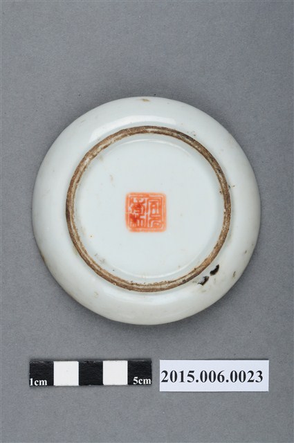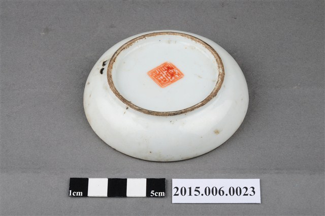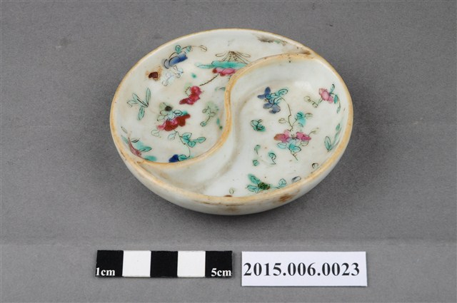 粉彩花卉紋雙格醬料碟,碟面直徑9cm,器高1.8m,中央分隔壁作S形,可盛裝兩種醬料。器身通體施白釉,再以手工繪製釉上彩。碟內滿繪花卉紋,繪製方式先以桃紅、青綠、淡綠、紫藍等色粉彩上色,再以極細墨筆勾勒出花草輪廓或葉脈。口沿帶有一周黃釉彩,但略斑駁,器底中央印有「同治年制」篆體方型朱印款識,推測為清末或日治初期彰化快官張家購買自中國進口之民用陶瓷器。