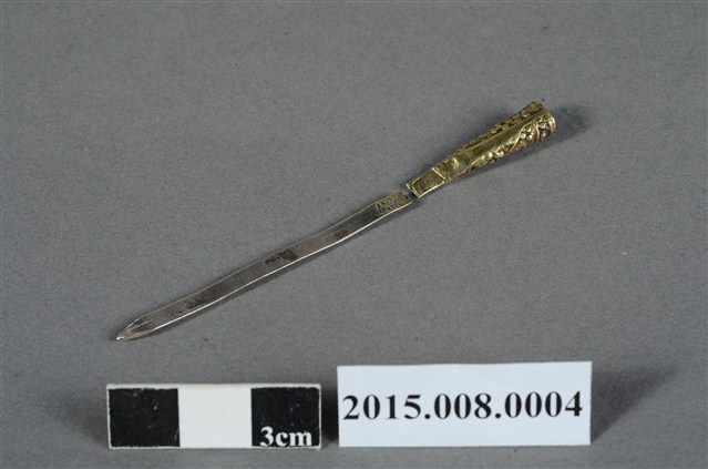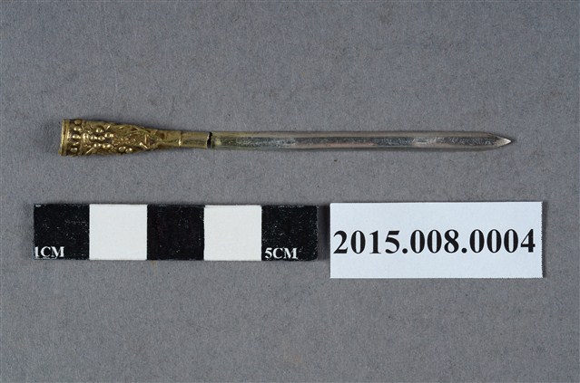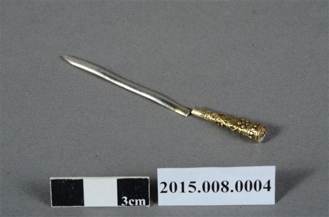 一字型髮簪是為美國奧勒岡大學歐獻文教授夫人張敏慧女士所捐。張敏慧女士為臺北大稻埕人士,家裡從事和洋商行。此髮簪原置於六角錫製粉盒底層,應同為家族內長者所擁有。此金屬髮簪本身鍍金漆方式來處理,銀製簪身已斷裂,而尾端呈現小捲筒形制,並有珠花紋飾。