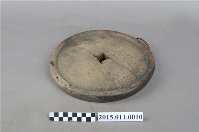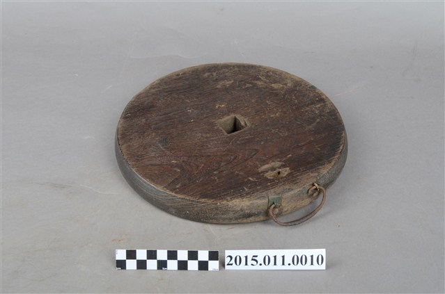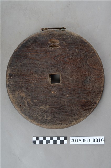 此為茶行廣告牌,形狀為茶盤樣貌,中間又有一方形孔,又形似古代銅錢(俗稱孔方兄),上題有「柵茶」廣告標語。