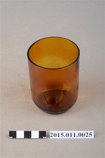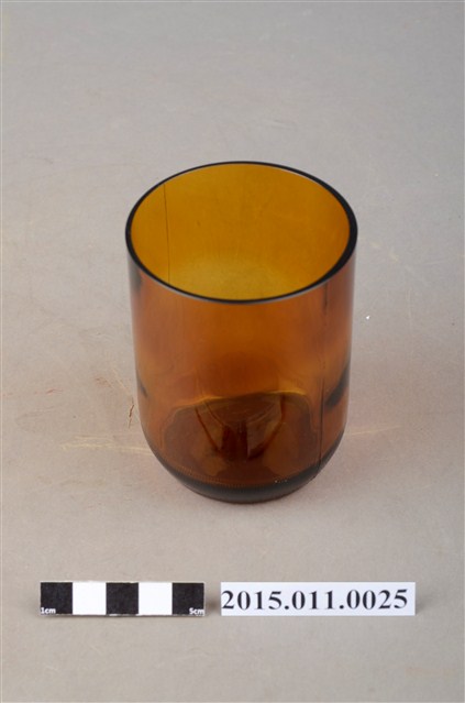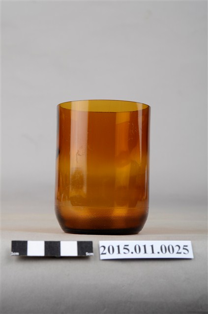 早期物資缺乏的年代,人們常常廢物利用,將要遺棄的物件,製成日常生活用品,此為 日本時代人們將由玻璃酒瓶空罐,將其瓶身切割,以其底部作為容器,再利用砂紙將切割沿口磨平,減低銳利,以此作為日常使用的茶杯,顯示出物質再利用的精神與智慧。