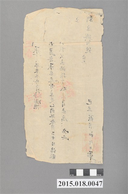 本張契約為清代臺灣田業宗卷買賣摘要浮籤,尺寸約22.7×11.3公分。上蓋有「三合」、「三合利記」等紅色戳印,涉及金額為77員。