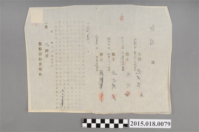 明治41年11月,主借沈少石等連帶借用金證書,等人向郭圓借六圓講會金,依照日本時代制式表格填寫,右上角貼有一錢印花。