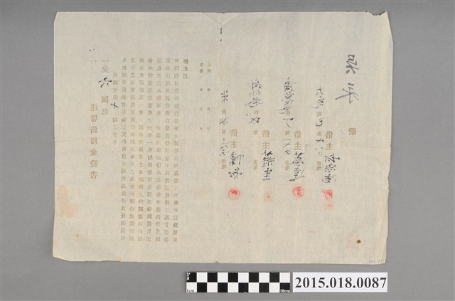 明治41年9月,鄭登才等人給吳永之連帶借用金證書,以15回貯金講會金鄭登才借六圓,依照日本時代制式表格填寫,借主共有4位分別為陳知、莊圭、蔡達、柯尚德。