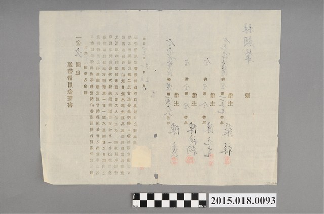明治41年12月,陳糞等人給林顏輦之連帶借用金證書,以貯金講會金陳糞等人借六圓,依照日本時代制式表格填寫,借主共有4位分別為陳糞、陳椅南、陳元寬、張祿,右上角貼有一錢印花。