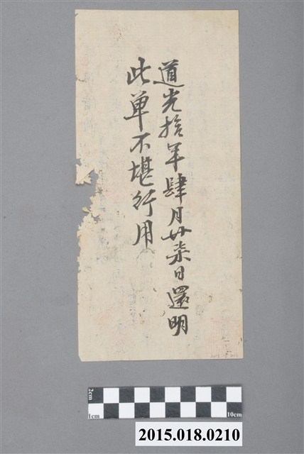 林紹音向蘇元友借款,約定金額及利息,本件為完還後的單據,故紙面上書寫完字。背面寫有道光拾年肆月二柒日還明,本單不堪使用。